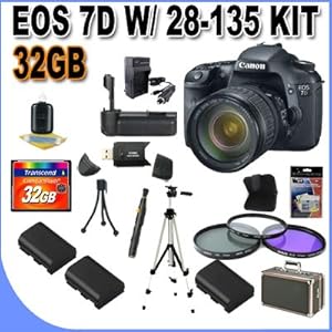 Kit Includes!1- Canon EOS 7D 18 MP CMOS Digital SLR Camera with 3-inch LCD and 28-135mm f/3.5-5.6 IS USM Standard Zoom Lens w/ All Supplied Accessories1- 32GB CF Memory Card (Don't Miss a Memory!)1- BATTERY GRIP (Shoot Longer and Stronger!) 3- Lithium Ion High Capacity Batteries (Great for Vacation!)1- Ac/Dc Rapid Charger1- UV, Florescent, Polarizer Filter Kit (Protect Your Lens!)1- USB Memory Card Reader (Download Images Quicker!)1- Shock Proof Deluxe Hard Case (Protect Your Camera!)1- Memory Card Wallet (Protect Your Photos!)1- Professional Full Size Tripod 1- Lens Pen Cleaner 1- Pack of LCD Screen Protectors (Protect from Dust And Scratches!)1- Lens/LCD Cleaning Kit1- Mini Table Size TripodMore About This Camera!With a host of brand new features designed to enhance every facet of the photographic process, from still images to video, the new EOS 7D represents a whole new class of camera. Made to be the tool of choice for serious photographers and semi-professionals, the EOS 7D features an all-new 18.0-megapixel APS-C size CMOS sensor and Dual DIGIC 4 image processors, capturing tremendous images at up to ISO 12800 and speeds of up to 8 fps. The EOS 7D has a new all cross-type 19-point AF system with improved AI Servo AF subject tracking and user-selectable AF area selection modes for sharp focus no matter the situation. The EOS 7D's Intelligent Viewfinder, an entirely newly designed technology, provides 100% coverage and displays user-selected AF modes as well as a spot metering circle and on demand grid lines